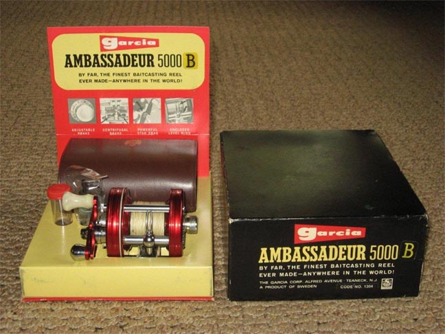 5000B.....Introduced in 1964, this reel is commonly known to collectors as the 5000 with a clicker. Actually when first produced, it didn't have a clicker but was sold with a counter balanced handle and large capacity spool. The box was marked "5000B" with matching serial number on the box bottom. About two years later a clicker was added. The reel itself was not engraved "B" until 1975.