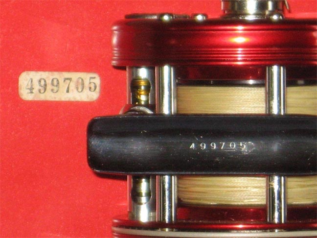RECORD Ambassadeur 6000 new in 1955 is mentioned here because this model never received serial numbers. The spool had gray arbor/red flanges with red star drag and never changed. This does not apply to prototype RECORD 6000 as some models were anodized in black having a solid gray spool and small black star drag. It's unclear at this time why ABU continued the practice of no serial numbers until 1964 when the first lot number was applied. Currently, the earliest lot number I've found for model 6000 is #070400 made in July, 1964. Early lot numbers are explained in detail later in this segment.