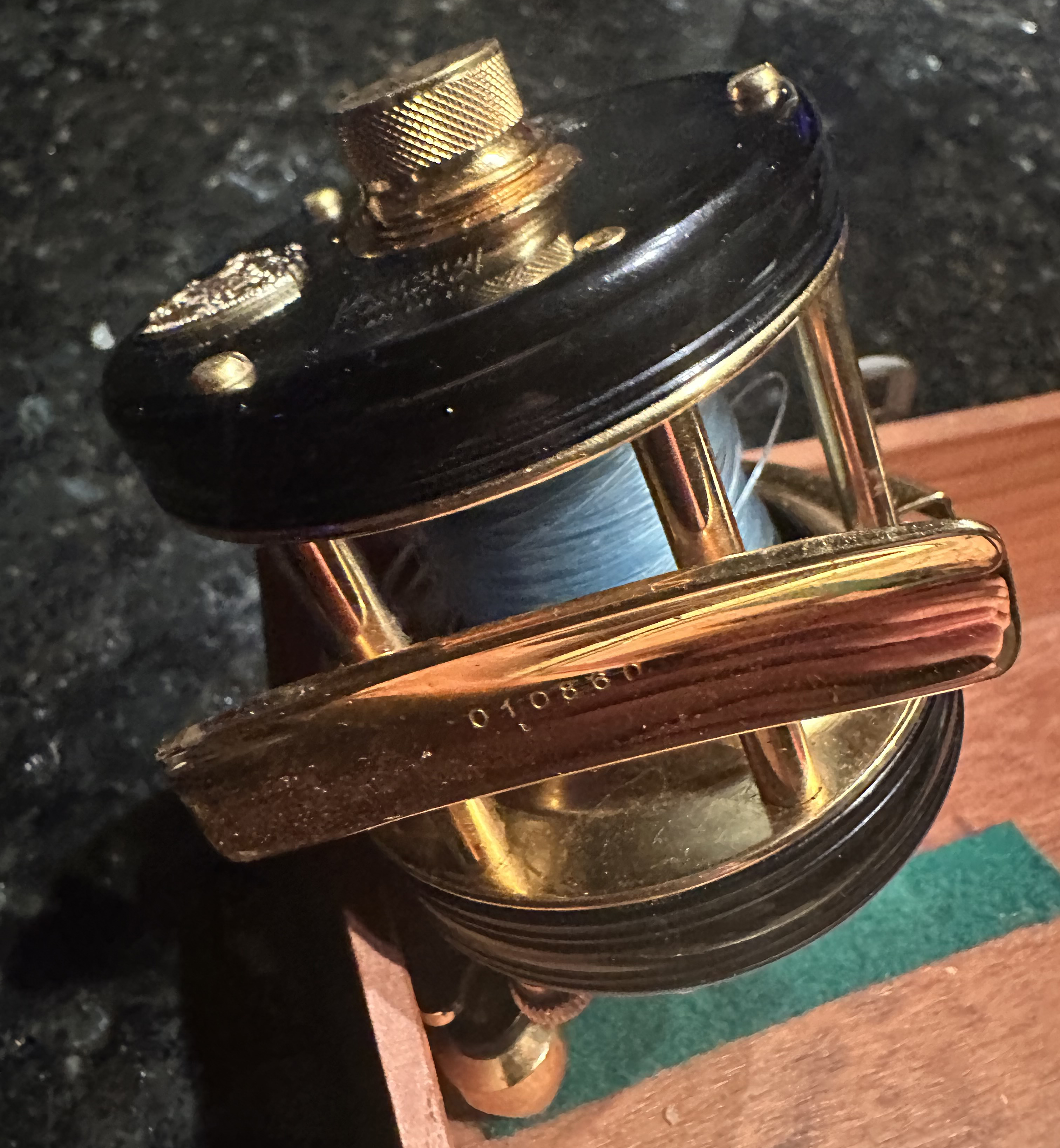 Flat head type pillar screws are correct and spool tension cap has the oil port suggesting this example was made some time between 1958 and 1961. Only by stripping line from the spool, can one see which type spool is installed. If the arbor is dull gray, the date can be narrowed to 1958-59.