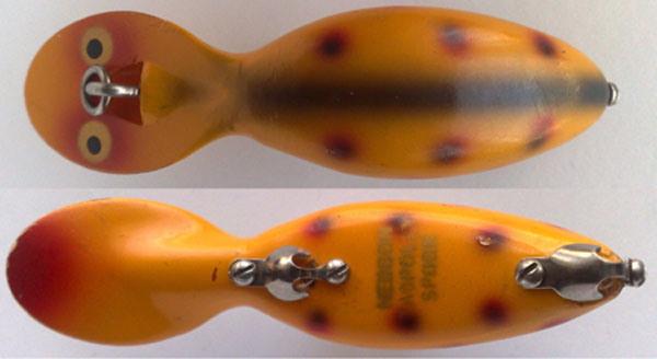 Along with the change of shape came a change of colour choice. The 1960 Heddon catalog listed only 6 available colors, Perch (L), Spotted Orange (SO), White, Red Head (RH), Black (B), Coach Dog (CD) and Yellow Coach Dog (YCD). I would like to say, gone were, but I’ll say I have not seen the Narrow Face Tadpolly Spook in Green Crackleback, Brown Scale, Golden Shiner, Light Green, Silver with Red and Black spots, Silver Shore Minnow, White Shore Minnow, Yellow with Black spots or Yellow Red Head finishes, though I live in hope that if I ever come across any of these I will be in a position to buy them!