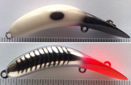 In the early 1970’s Heddon started producing Tadpollys with a chrome or nickel plate type finish. This brought forth a range of lures with coloured paint accents or details overlaid on the bright metallic finish. The years of 1977 and 1978, when Heddon had found a way to colour the lures without paint, saw the number of colour options flourish. After the further introduction of fluorescent or Day Glo paint finishes, and also a luminous paint which when charged with light, would then glow in the dark in a green hue, the permutations seemed endless. In fact I have recently heard of a collector who has over 320 different 3” Tadpollys. The luminous Glo Tads as they were called, were available in Blue (DBL), Green (DG), Brown / Khaki (KA), Red / Pink (DPK) and Yellow (DY), with just the back of the lure coloured. Series numbers had the last digit increased by 1 so a 9000 Tadpolly in Glo would be 9001. Later models had both the back and bill of the lure coloured, along with a silver scale pattern added to the flanks. To complement the five basic Glo Tads, Heddon produced other glow in the dark finishes such as the Glo Rib Alewife, a luminous body with fluorescent red ribs and another for which I have the colour code, VGR, but no name. This beauty again has a luminous body but with fluorescent orange spots, presumably using the same spray masks as other spotted lures. 1983 was the last production year for the Glo Tads. A point has to be made that the coloured paint used does not last as well on the luminous coating, meaning many early Glo Tads are seen, even in unopened boxes, where the colour has faded to such an extent that without the box and code, it is almost impossible to tell the original colour.