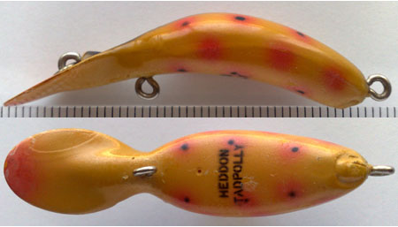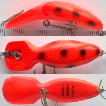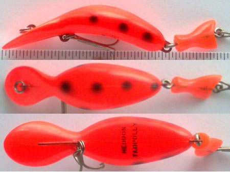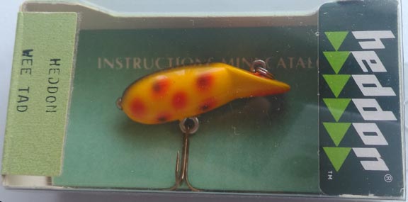 Mention has to be made here of a small fly rod / ultralight size bait which, because of a very limited production run, just 1982 – 1983, is very rarely seen and will command asking prices often in excess of $50. Only generally found in a few ‘standard’ colours, such as Spotted Orange and Black Shore Minnow, the Wee Tad, Heddon series #590, with only one treble hook attached, is more similar in shape to Heddon’s earlier wooden Widget lure, Heddon series #300, from the mid 1950s, albeit with a thicker neck and straighter body shape, than the classic elegant Tapolly curves. Like other Heddon lures, Wee Tads can occasionally show up in unique or uncatalogued colours. They also may or may not have a name stencil on the back of the 1 -1/4” body, as opposed to Heddon’s customary belly position.