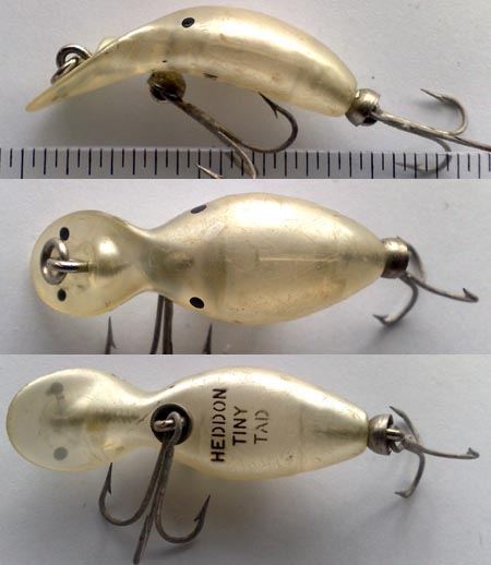 Fitted with the same surface hardware as other Heddon lures of the era, the 1952 Heddon catalogue introduced the lure in 12 different colors: Black and White Shore Minnow (XBW), Bullfrog (BF), Golden Shiner (PG), Light Green Scale (LD), Yellow Perch Scale (L), White, Red Head (RH), Red Head Flitter (RHF), Silver Body, Red and Black spots (SRB), Silver Shore Minnow (XRS), Spotted Orange (SO), Yellow Body Red Head (YRH), and Yellow Shore Minnow (XRY). All of these had gold painted eyes with black pupils and red tip on the underside of the bill with the exception of the Black and White Shore Minnow which did not have the red tip. Since the initial writing of this article, I have been advised on good authority that the range of available colors with gold eyes, beyond the catalog colors, includes Tadpollys in Fish Flash colors, Green Shad and even one with the Westinghouse logo, an 'advertising' logo which has been seen on other Heddon lures. These three I have never come across so irrespective of being low volume issues or not, they are pretty hard to add to any collection.
