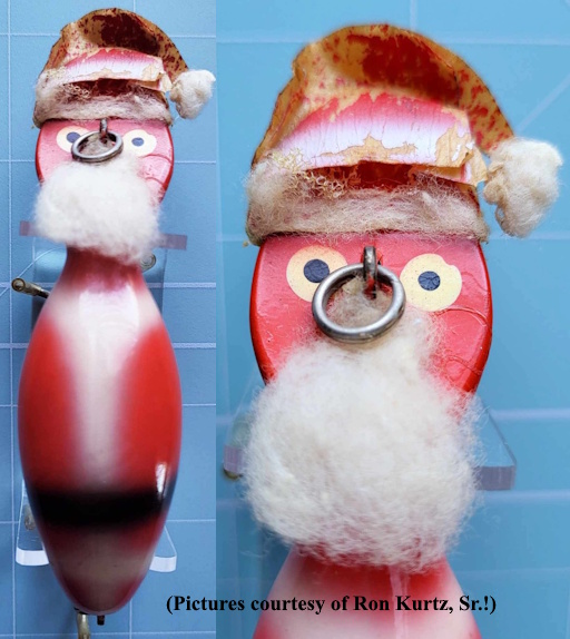 The "Santa" Tadpolly is another unusual lure, painted as to represent a Santa coat, had tasseled brimmed hat and beard and made in the Magnum Tadpolly size, Heddon series #9006. The Magnum Santa is generally believed to have been issued to Heddon employees only and not to retailers. There is no evidence to confirm this other than the fact it wasn't catalogued so that might explain its scarcity and hence the high value of the gentleman in question!