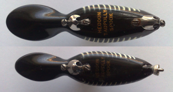 By 1962 Heddon had reverted back to the earlier shape Tadpolly Spook, possibly because the Narrow Face model was not as popular with anglers for some reason. In 1968 the Tadpolly Spook disappeared from Heddon’s annual catalogue but reappeared in the 1969 edition. This coincided with a change in ownership of the company, and when the reissue occurred, the Tadpolly had undergone another minor design alteration. The body used a different mould which was cruder in shape, with hard edges particularly on the shoulders, and a noticeable neck seam. Cruder they may have been, but not as crude as some cheap copies, with different diameter eye screws, that surface for sale occasionally. Side by side and with both in hand, the poor quality copies are easy to spot, plus they are noticeably lighter in weight.