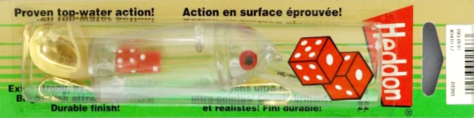 DESCRIPTION: | Clear, plastic Big Bud lure with 2 red dice inside the body with white spots and orange/black eyes. For more detailed information on Heddon Big Bud lures, visit MyBaitShop.Com's Heddon Big Bud web page. (Picture courtesy of Chuck's Tackle Box!)