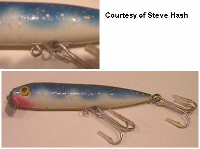Best known, however, are the Jinx line of lures. The Jinx lures basically came in two sizes, the Bass size and the Musky size. The bass size Jinx is 2-1/4" in length and is a plastic lure. It has surface hardware on the belly and a eye-screw hook hanger on the tail. The bass size Jinx also came in a version called the "Buzzer" that has a spinner on the nose and tail.