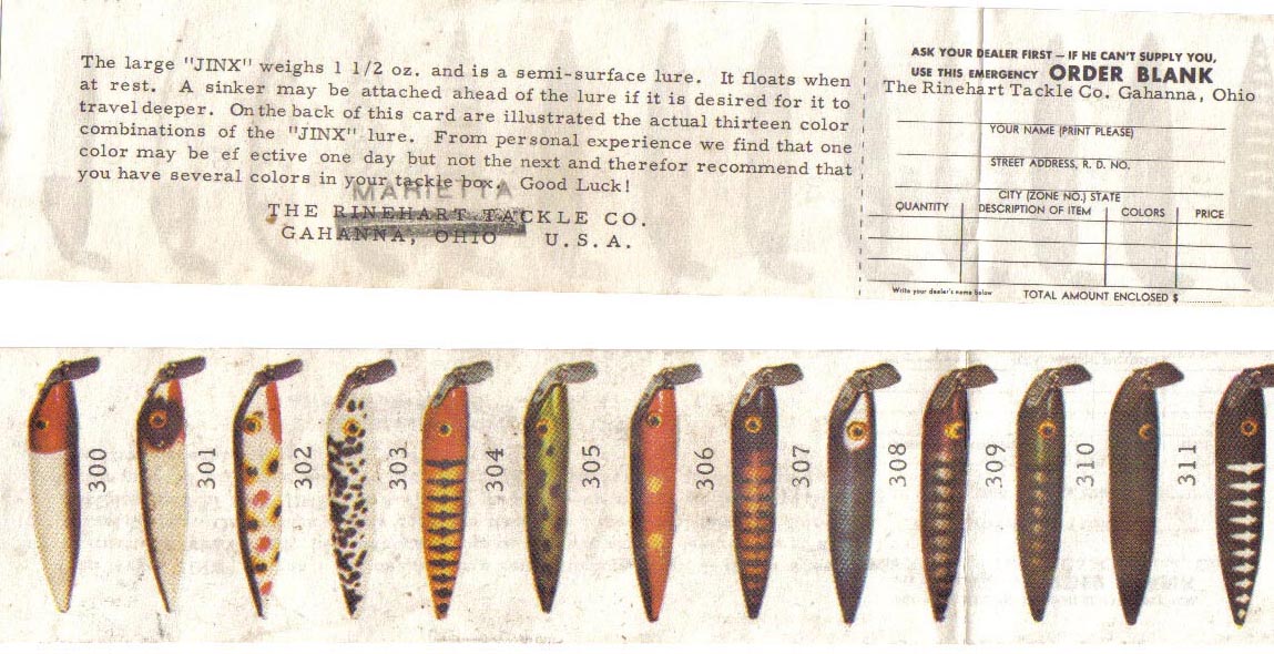 UPDATE: To learn more about Rinehart and the company's lures, pickup a copy of the book, "There's Something About A Jinx - The Fred Rinehart Company" by Cecil Douglas Carpenter published in January, 2013. This book is available from the Whitefish Press!